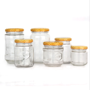 150ml 180ml 300ml 600ml 700ml Iraq Hot Sale Round Shape Bee Honey Glass Container Jar With Honeycomb Printed Lids